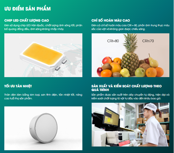 • Chất lượng ánh sáng cao (CRI> 80) tăng khả năng nhận diện màu sắc của vật được chiếu sáng