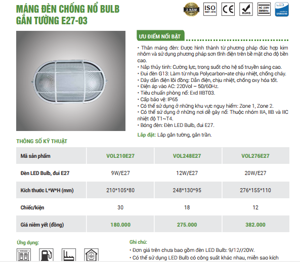 MÁNG ĐÈN CHỐNG NỔ BULB GẮN TƯỜNG E27-03 VOLIGHTING