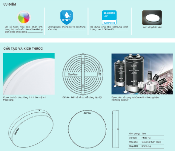 • Tuổi thọ dài, ít phải thay thế, dễ dàng lắp đặt, thay thế đèn ốp trần lắp sợi đốt, compact.